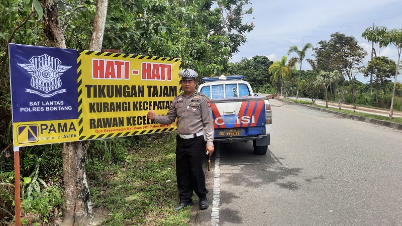 Satuan Lantas Polres Bontang melakukan pemasangan spanduk peringatan Laka Lantas
