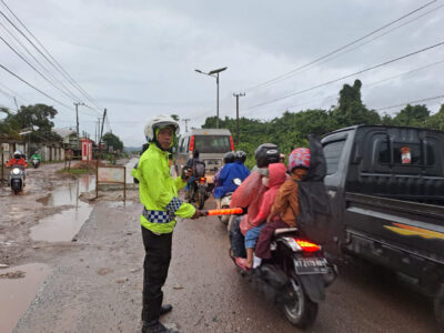 Antisipasi Kemacetan, Personel Satlantas Polres Kutim Laksanakan Gatur Lalin Ditengah Kondisi Hujan