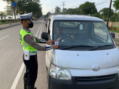 Satlantas Polres Kukar Bagikan Stiker Tertib Lalu Lintas Kepada Pengguna Jalan
